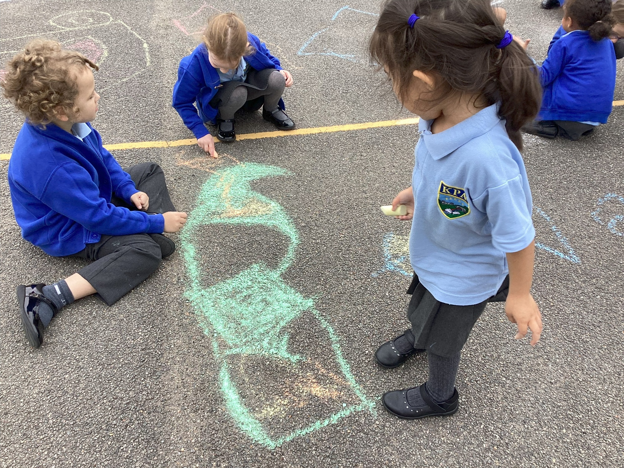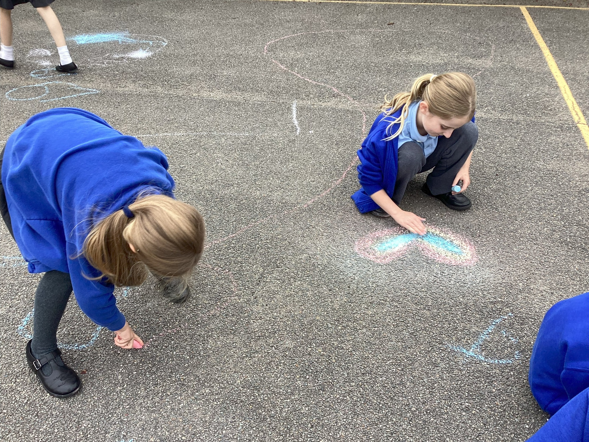 We invited children from all classes to draw on the playground with chalk. We gave children a choice of drawing on paper or using chalk on the floor - they all choose the floor! I started by drawing a heart on the floor with chalk and lots of children came to join.