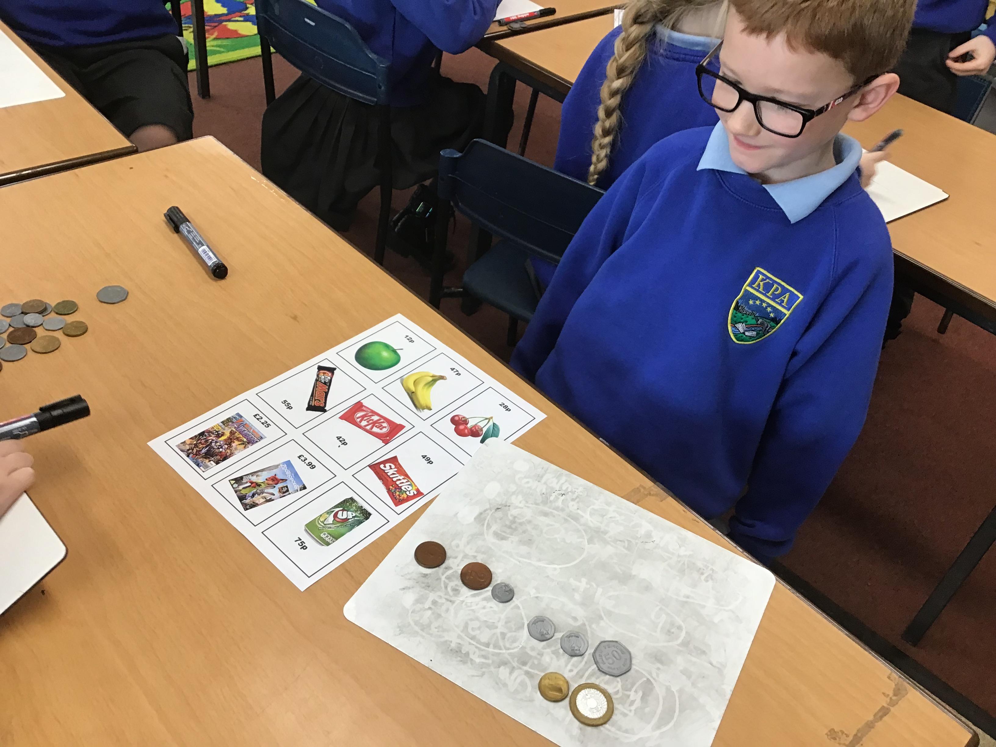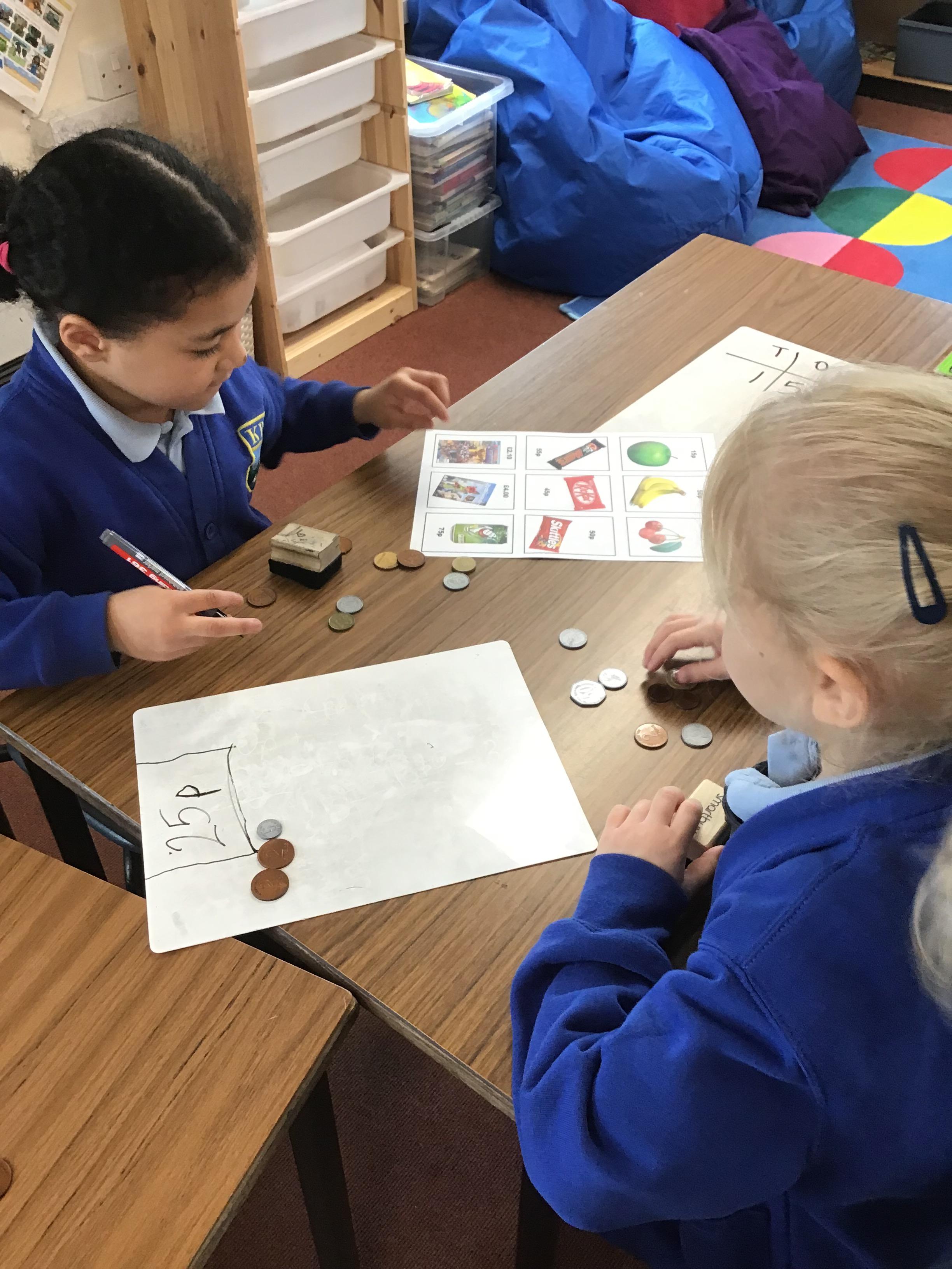 This week in Maths we have mainly been looking at our tests papers to see if we can solve the trickier questions in pairs and spot our own mistakes. We have also continued our learning about money by refreshing our knowledge of coins and calculating change in our pretend shops!