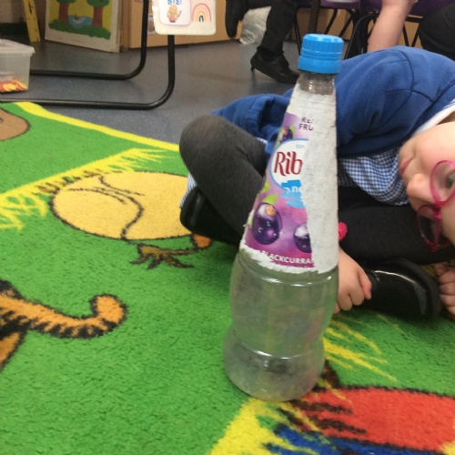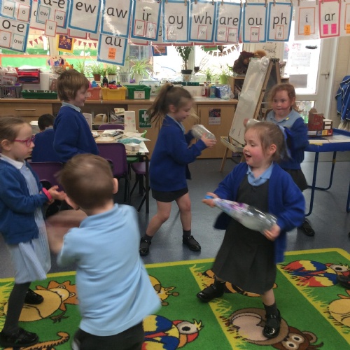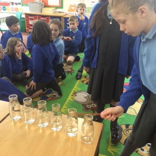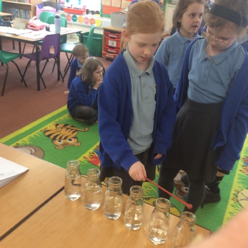 Music Makers – In this activity, children filled glass bottles with different volumes of liquid and investigated how the pitch changed depending on the volume. They tried tapping the glass bottles with different tools to see how this changed the sound too. Year 4 were able to link this to our Science topic as they understand that sound travels through vibrations.